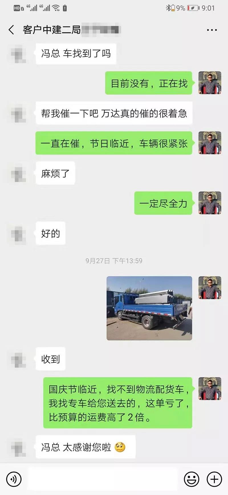 我们负责物流运输的同事接连两天没有联系到合适的配货车辆,9月27日,现场项目经理王总把电话直接打给了冯总,希望我们能帮忙尽快将楼承板提前运至现场。