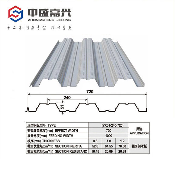YX51-240-720-1.0厚压型钢板可以取代传统模板、改善传统模板缺点,省却传统模板拆卸安装工作;重量轻、强度高、承重大、抗震性好;可作为钢结构强度一部分、减低材料成本;施工简单快捷、拼装方便;易于配筋、配线、配管施工。