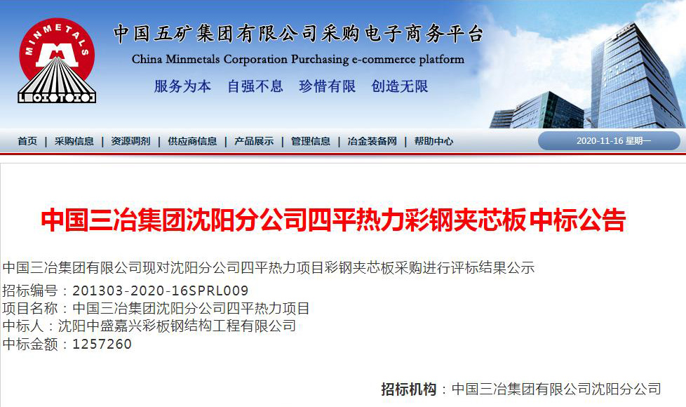 (编者按)进入十一月份,中盛建筑钢品(沈阳)有限公司(以下简称:中盛建筑钢品)捷报频传,即一汽集团长春汽开区繁荣智能制造产业园(一汽红旗新能源汽车)项目闭口楼承板供应顺利收尾后,于11月6日又成功中标中国三冶集团沈阳分公司四平热力项目彩钢夹芯板项采购合同,该项目将使用我公司生产的岩棉夹芯彩钢板,中标面积12000平方米,中标总价:1257260.00元。