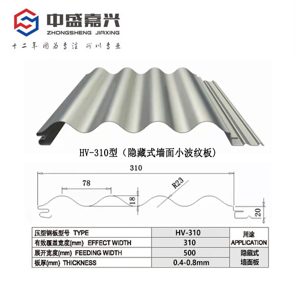 HV-310彩钢板(310型隐藏式波纹彩钢板)进料宽度为500mm,由四个波组成,该彩钢压型板一般以国内常用的彩板为材料,其巧妙合理地设计其波峰与波谷之间的间距和峰谷高度,使彩板的力学性能达到了较佳状态,抗风性能比其它彩板产品提高2倍以上。在结构上采用波浪形圆弧,组合后外观流畅,充分体现了钢结构建筑的美感。波峰间排列紧凑,采用隐蔽式自攻螺钉,使外观更加简洁。