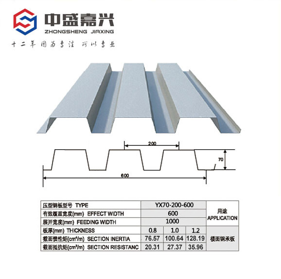YX70-200-600压型钢板是一款开口式压型钢板。沈阳中盛嘉兴YX70-200-600-1.5mm压型钢板采用厚度为1.5mm,宽度为1000mm的镀锌钢板辊压而成,成型之后的肋高为70mm,由三个波组成,每个波距为200mm,整板宽度为600mm,使用率为60%。