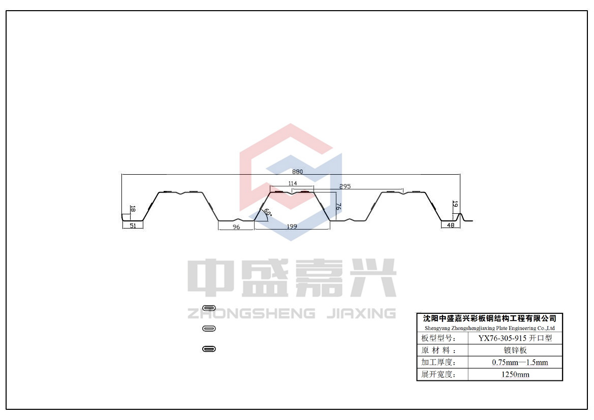 YX76-305-915是3W开口楼承板中利用率比较高的一款板型,它的波高为76mm,由三个波组成,每个波距为305mm,它的进料宽度为1250mm,成品有效宽度915mm,有效利用率为73.2%。该板型是在80年代由欧美进入中国,俗称3英寸板,简称“3W”,他的肋高比较高,最大无支撑跨度距离可以支撑到3米多,而且可支撑楼板的厚度比较厚,适合东北高寒地区地面铺设地热使用。当年引入国内后,受当时原料等因素影响,国内把他改变为YX76-344-688型,也就是经常听到和用到的经典688型楼承板,但是YX76-344-688和YX76-305-915相比,无论是截面特性、可支持跨度还是经济性上,与YX76-305-915还是稍差一点,以后中盛嘉兴还会对两个板型专门写文章进行数据对比分析。