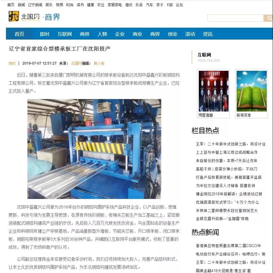 《媒体看中盛》北国网:辽宁省首家综合型楼承板工厂在沈阳投产
