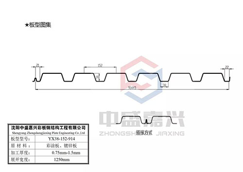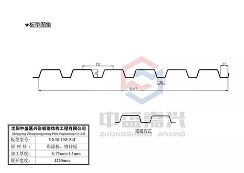 YX38-152-914型开口压型钢板,肋高为38mm,每个波距为152mm,整板有效宽度为914mm,展开宽度为1250mm,有效使用率为73.1%。