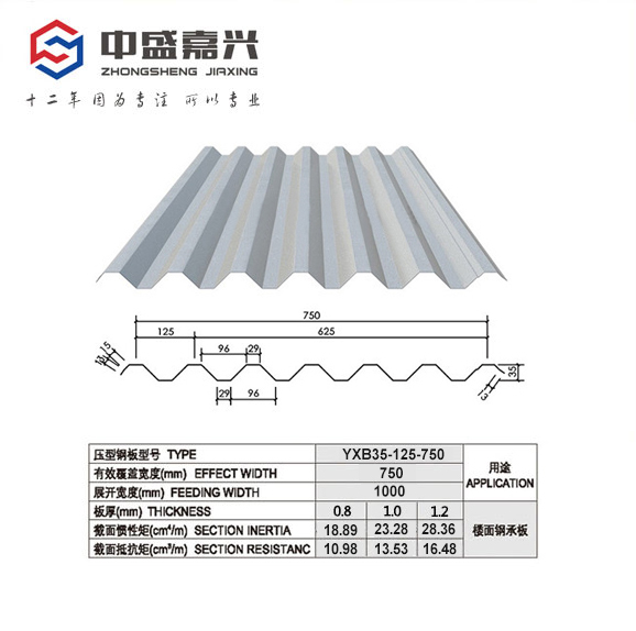 yx35-125-750压型钢板是常用的压型钢板板型之一。东北压型钢板加工基地-沈阳中盛嘉兴可加工YX35-125-750压型钢板厚度为0.4~1.5mm。